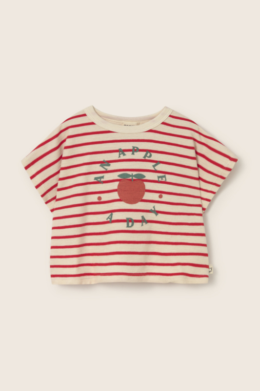 T-shirt van Cozmo in een double-faced striped cotton print, een dubbelzijdige katoenkwaliteit met zachte structuur en subtiel streeppatroon. Het gebruik van biologisch en gerecycled katoen maakt het shirt extra duurzaam en comfortabel. En met een vrolijke tomatenprint is het natuurlijk helemaal af!